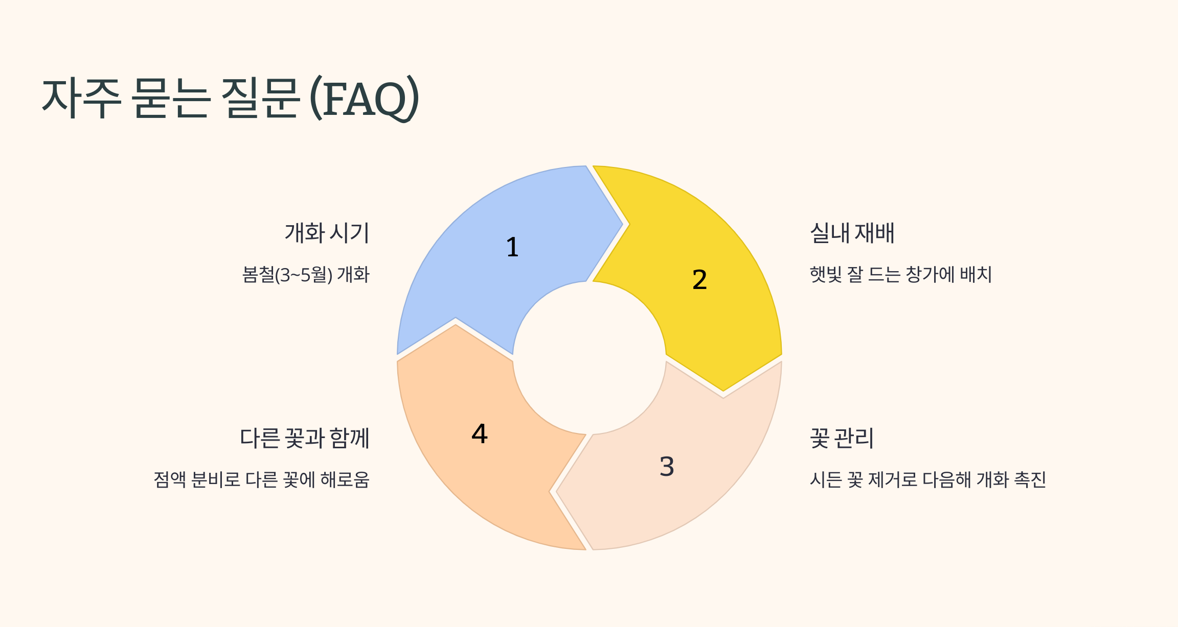 | 햇빛 | 하루 6시간 이상의 햇빛이 필요하며, 반그늘에서도 잘 자랍니다. |