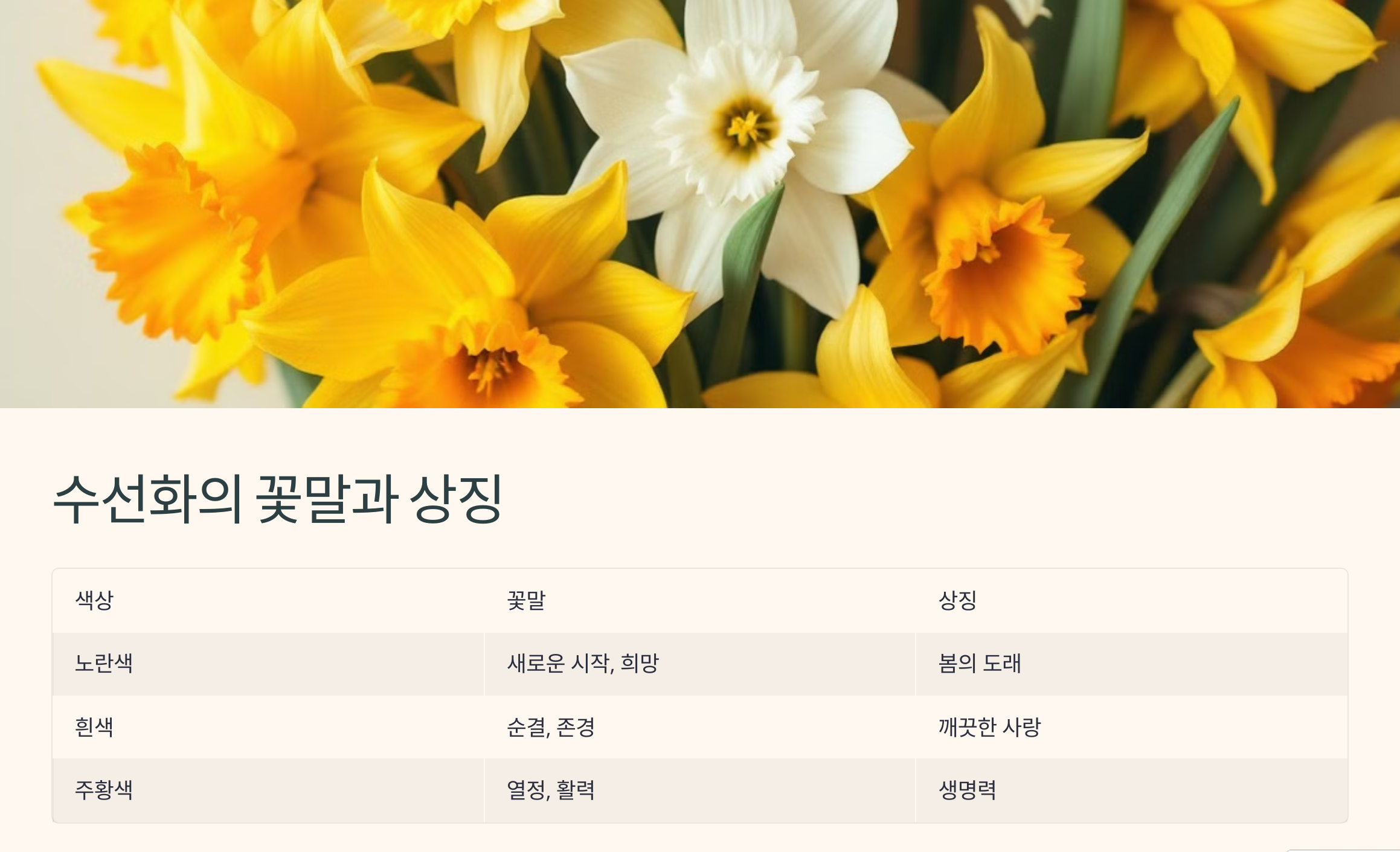 수선화는 색상에 따라 다양한 의미를 가지고 있습니다. 보통 '자기애', '희망', '새로운 시작'을 상징하지만, 각 색상별 꽃말에는 미묘한 차이가 있습니다. 아래 표에서 확인해 보세요.