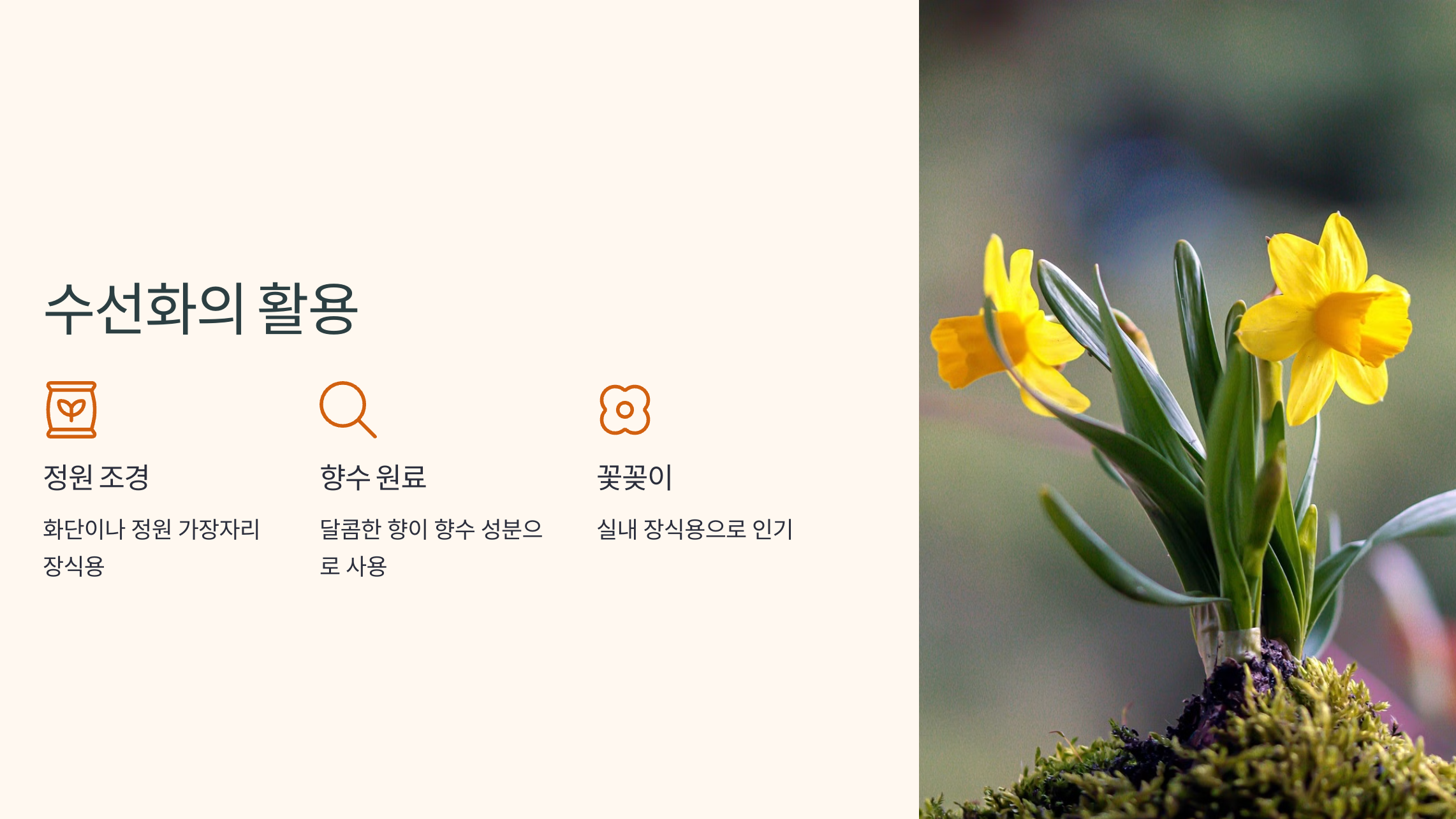 수선화는 단순히 감상용 꽃이 아닙니다. 그 아름다움과 향기를 활용해 다양한 용도로 사용되고 있습니다. 대표적인 활용 방법을 정리해 보았습니다.