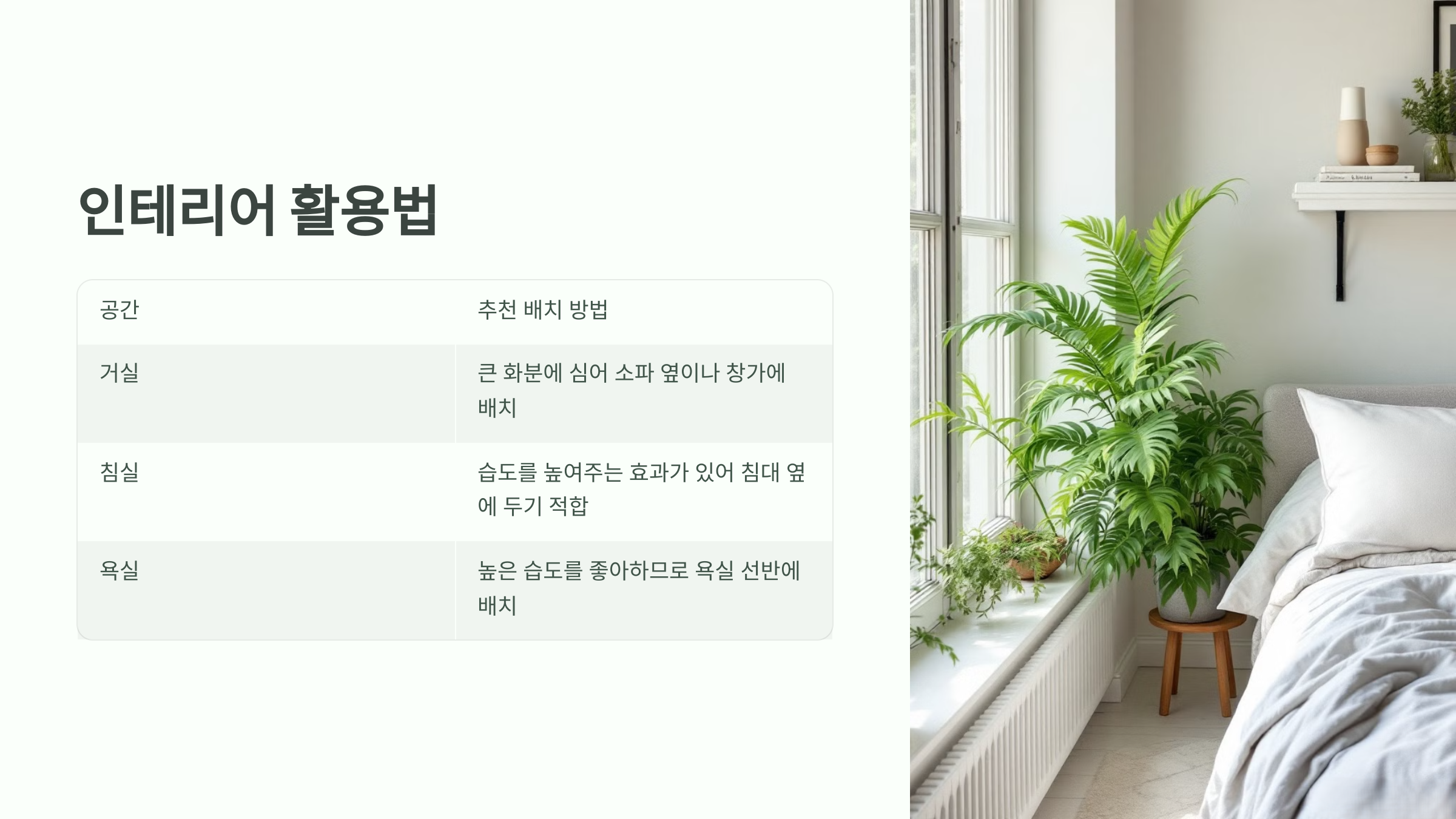 | 침실 | 습도를 높여주는 효과가 있어 침대 옆에 두기 적합 |