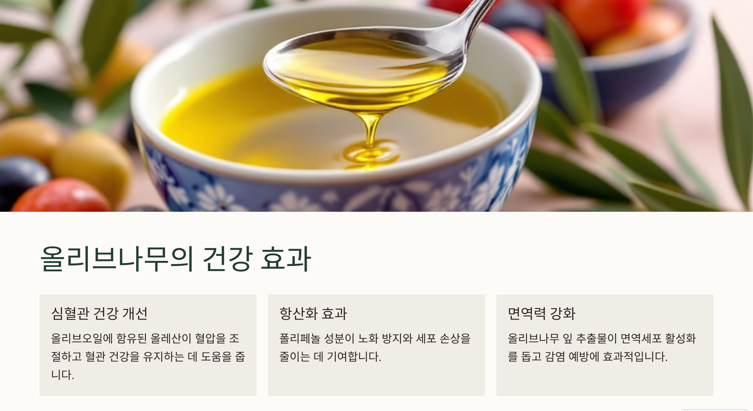 | 면역력 강화 | 올리브나무 잎 추출물이 면역세포 활성화를 돕고 감염 예방에 효과적입니다. |