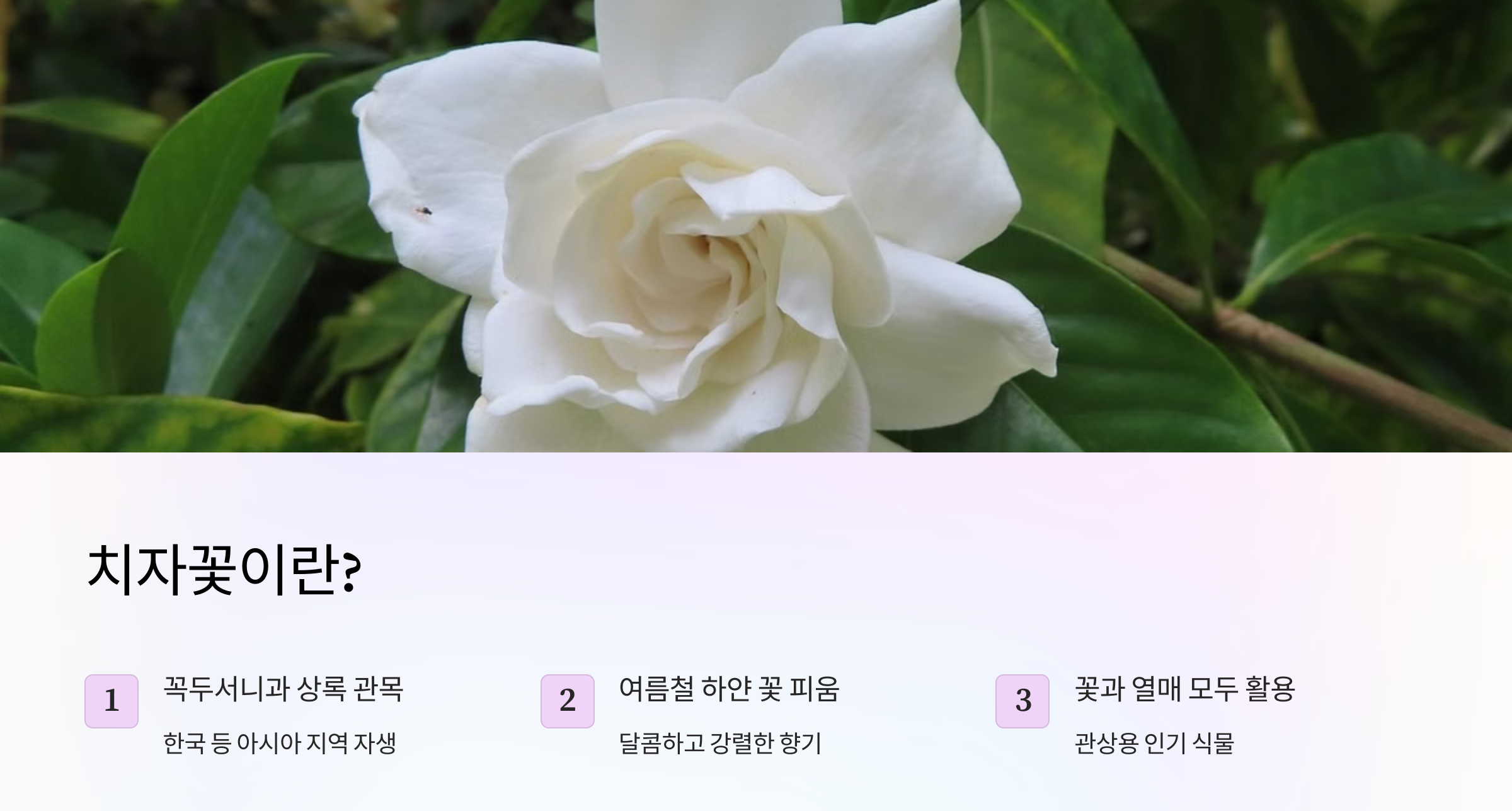 여름이 오면 짙은 녹음 속에서 하얀 치자꽃이 피어납니다. 눈부신 꽃잎과 달콤한 향기는 사람들의 마음을 사로잡죠.