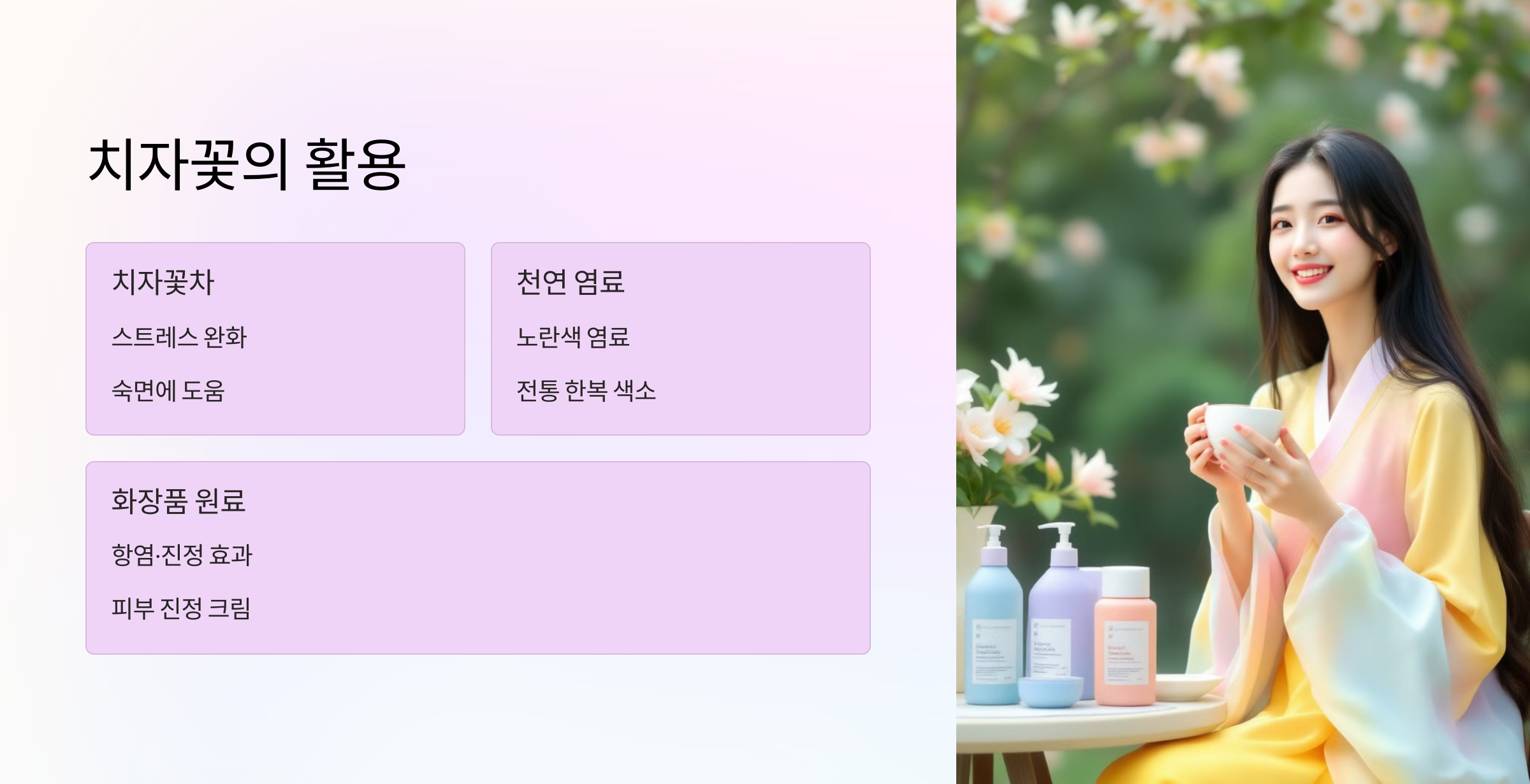 • 화장품 원료: 치자의 항염·진정 효과 덕분에 피부 진정 크림, 스킨케어 제품에 사용됩니다.
