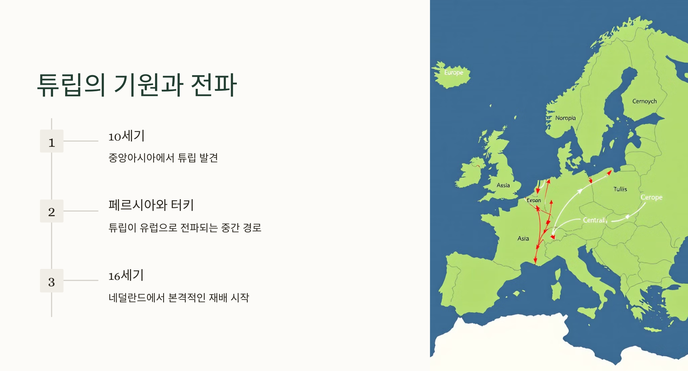튜립의 원산지는 네덜란드가 아니라 중앙아시아입니다. 튜립은 10세기경 페르시아와 터키를 거쳐 유럽으로 전파되었습니다. 오스만 제국에서 튜립은 귀족과 왕실에서만 볼 수 있는 특별한 꽃이었죠. 16세기 네덜란드로 전해지면서 본격적인 재배가 시작되었고, 점차 세계적인 인기 꽃으로 자리 잡았습니다. 특히 네덜란드는 튜립을 국가적 상징으로 삼을 정도로 이 꽃을 사랑하게 되었죠.