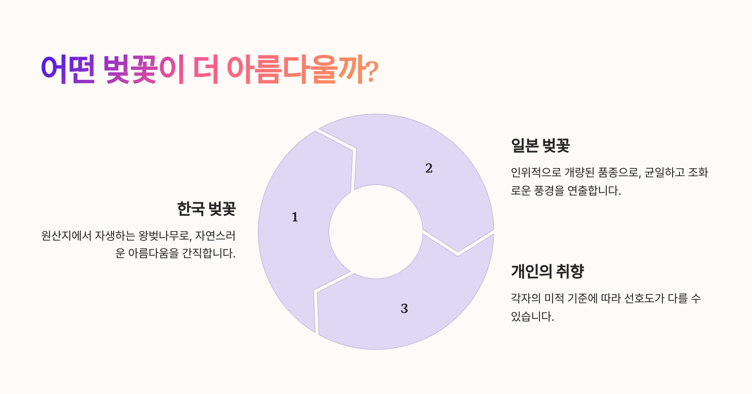 - 일본 벚꽃: 인위적으로 개량된 품종으로, 균일하고 조화로운 풍경을 연출함.