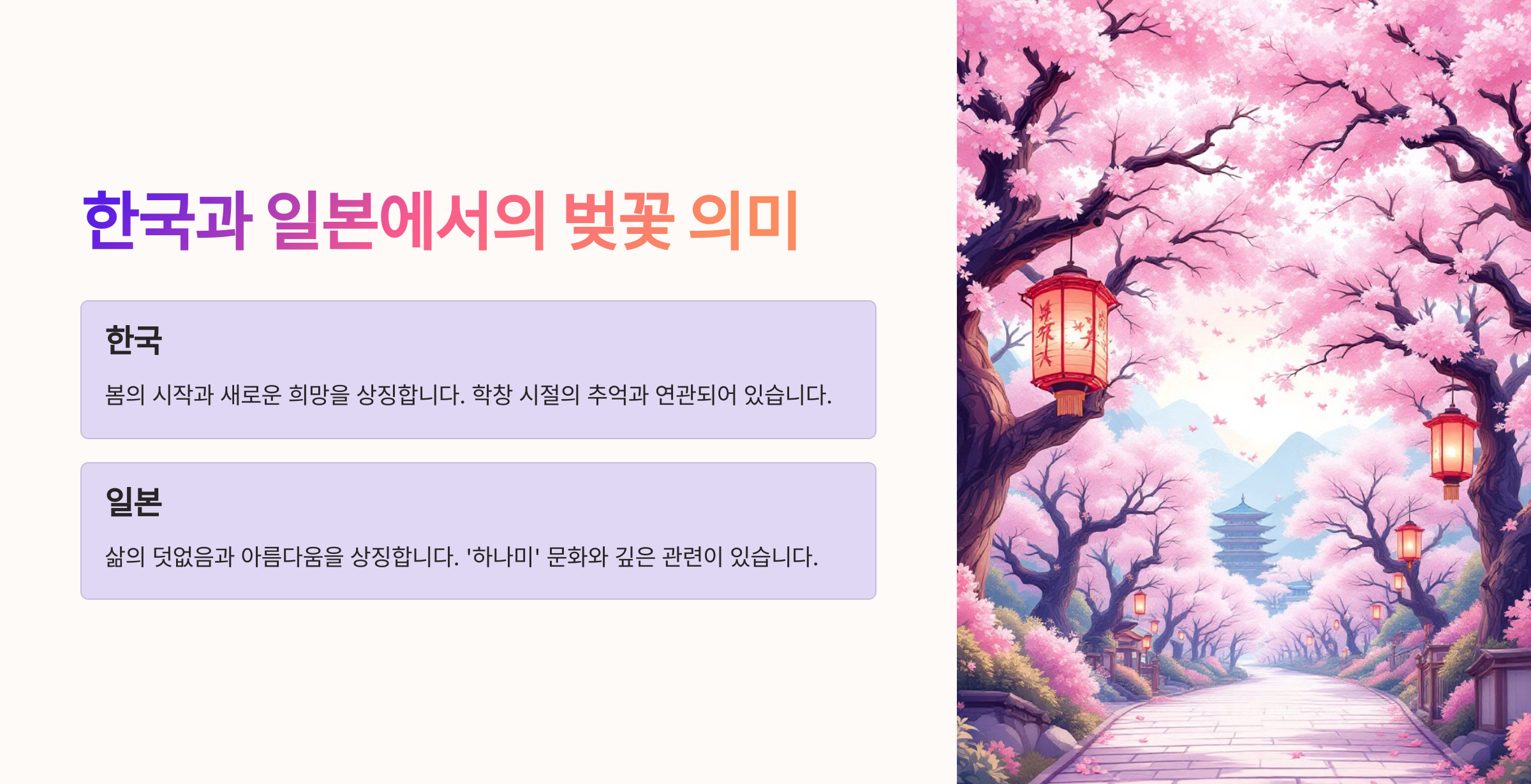 벚꽃은 한국과 일본 모두에서 봄을 상징하는 중요한 꽃이지만, 그 의미에는 차이가 있습니다.