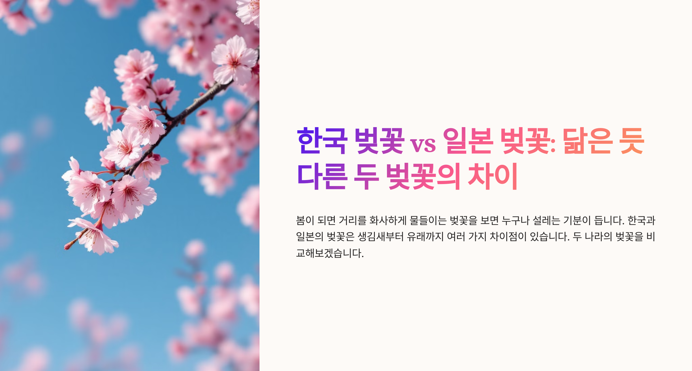 안녕하세요, 봄이 되면 거리를 화사하게 물들이는 벚꽃을 보면 누구나 설레는 기분이 들죠. 하지만 우리가 즐기는 벚꽃이 한국의 토종 벚꽃인지, 일본에서 온 벚꽃인지 생각해 본 적 있나요? 사실 한국과 일본의 벚꽃은 생김새부터 유래까지 여러 가지 차이점이 있습니다. 오늘은 한국 벚꽃과 일본 벚꽃의 차이를 비교하며 각각의 특징을 알아보겠습니다.