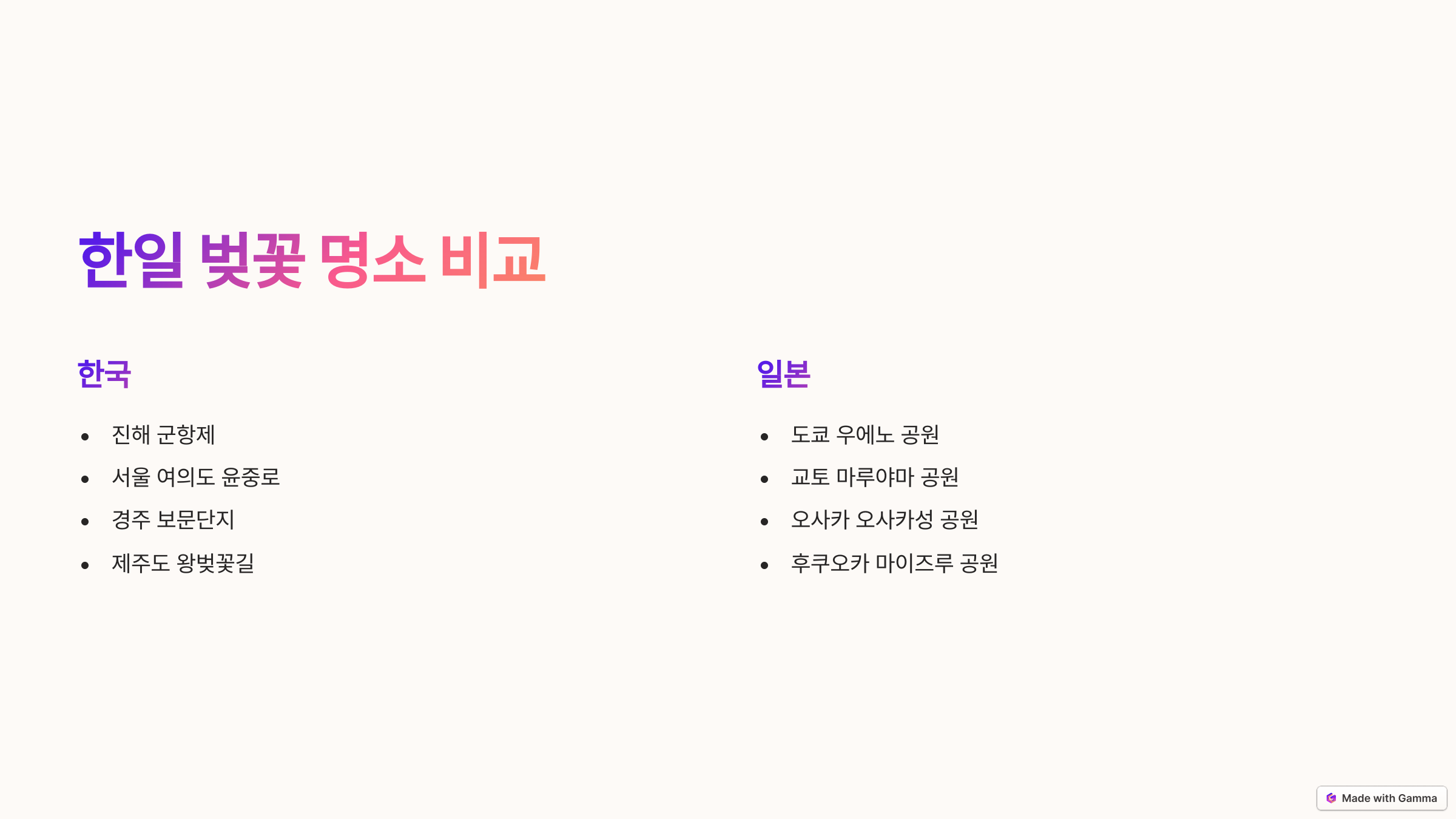 벚꽃이 만개하는 시기에는 많은 사람들이 아름다운 벚꽃 명소를 찾습니다. 한국과 일본의 대표적인 벚꽃 명소를 비교해 보겠습니다.