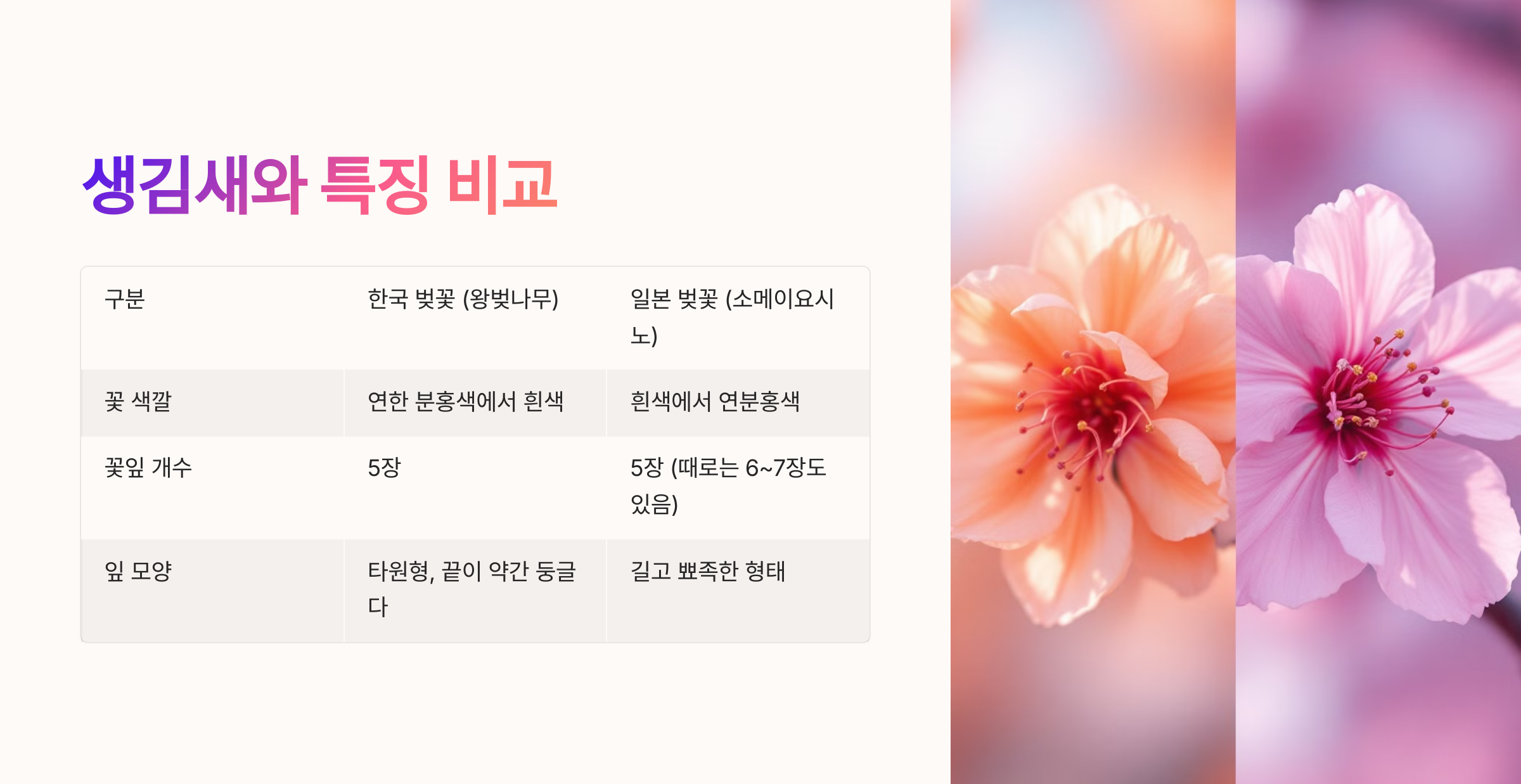 | 구분 | 한국 벚꽃 (왕벚나무) | 일본 벚꽃 (소메이요시노) |