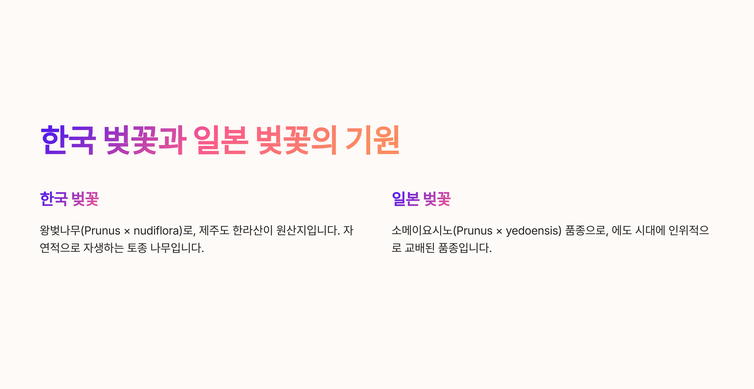 한국과 일본의 벚꽃은 오랫동안 그 기원에 대한 논란이 있었습니다. 한국의 벚꽃은 대표적으로 왕벚나무(Prunus × nudiflora)로, 제주도 한라산이 원산지로 알려져 있습니다. 반면, 일본에서 가장 많이 볼 수 있는 벚꽃은 소메이요시노(Prunus × yedoensis) 품종으로, 에도 시대(17~19세기)에 인위적으로 교배된 품종입니다.