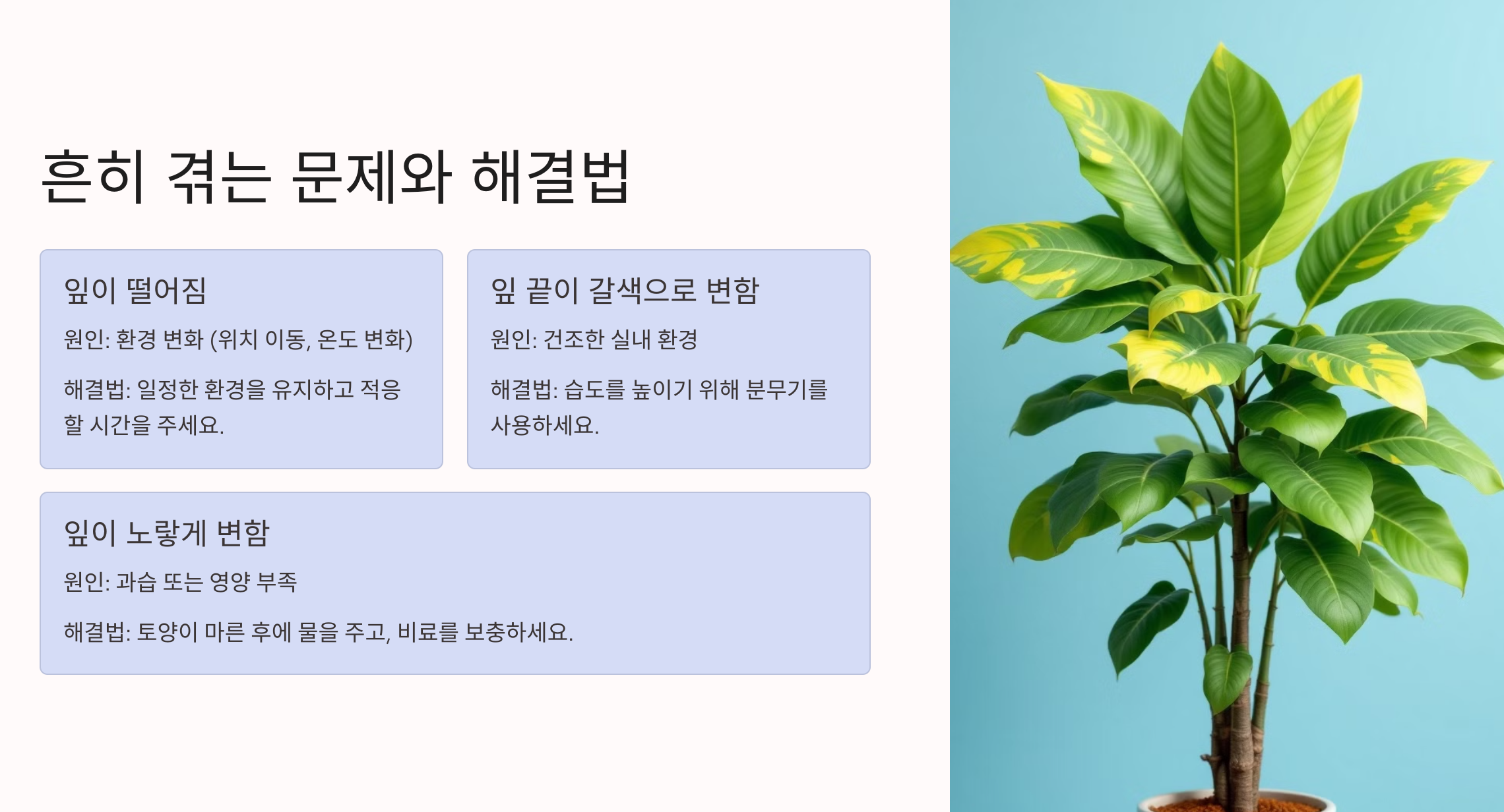🌿 뱅갈고무나무를 키울 때 몇 가지 문제들이 발생할 수 있습니다. 하지만 원인을 알고 적절한 대처 방법을 적용하면 쉽게 해결할 수 있어요.