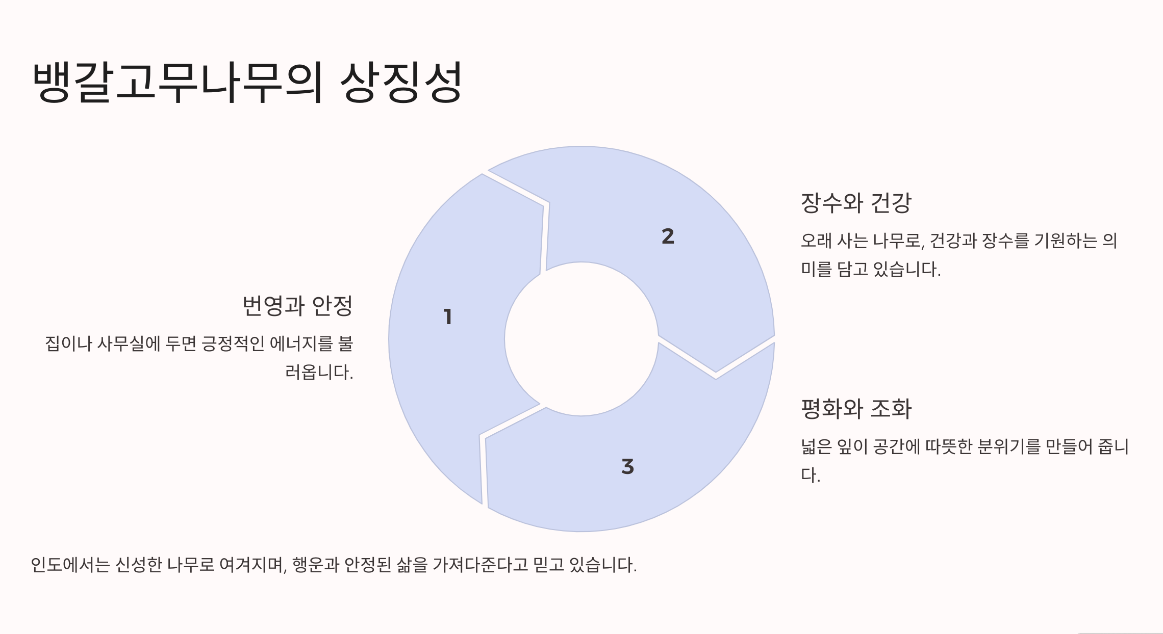 🌿 뱅갈고무나무는 풍요와 장수를 상징하는 식물로 알려져 있습니다. 인도에서는 신성한 나무로 여겨지며, 행운과 안정된 삶을 가져다준다고 믿고 있어요.