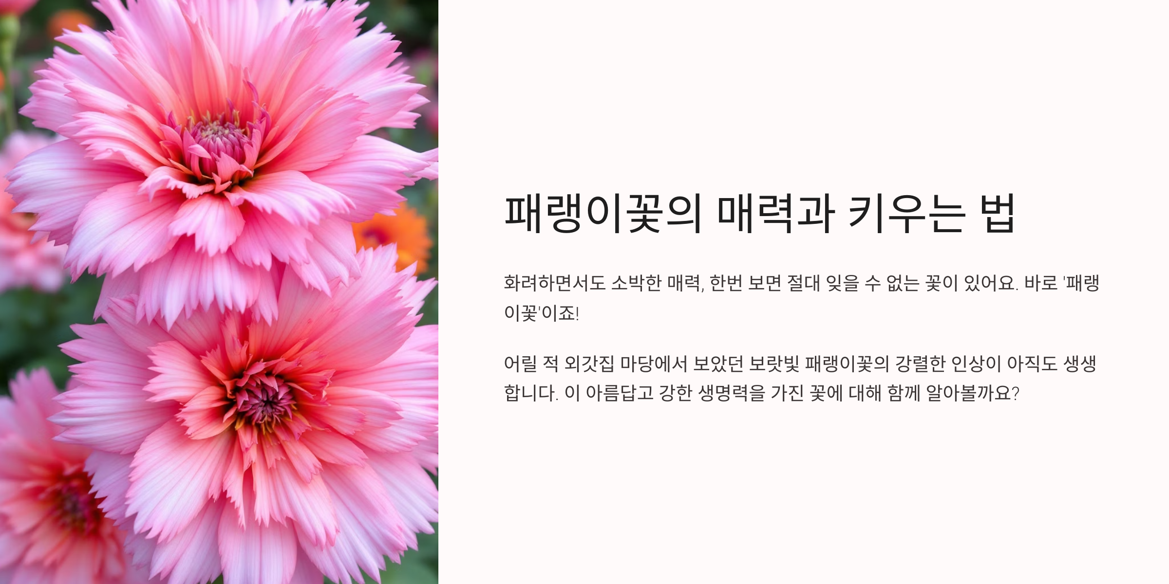 안녕하세요, 여러분! 요즘 날씨가 따뜻해지면서 자연스럽게 꽃에 눈길이 가더라고요. 제가 어릴 적, 외갓집 마당 한 켠에서 보랏빛으로 피어있던 패랭이꽃이 생각났어요. 그 소박하면서도 강렬한 인상, 잊히지 않더라고요. 그래서 오늘은 이 아름답고 강한 생명력을 가진 패랭이꽃에 대해 이야기해보려고 해요. 이름만 들어도 정감 가는 이 꽃, 알고 보면 키우기도 어렵지 않답니다. 그럼 같이 한번 알아볼까요?